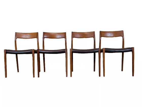 4 sillas de comedor de teca de los años 60 y 70 de Niels O. Möller para JL Møllers. Artículo: 4 sillas. Fabricante: JL Møllers. Estado: Bueno - Vintage. Edad: Aprox. 1960-1970. Dimensiones: Ancho = 50 cm. Fondo = 48,5 cm. Alto = 76,5 cm. Altura del asiento = 44 cm. Información adicional: Las imágenes son parte de la descripción. Tenga en cuenta que vendemos artículos usados; no son nuevos, por lo que pueden presentar signos de desgaste.