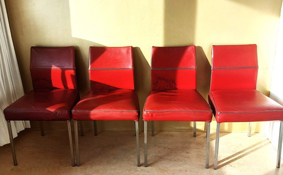 Estas sillas "Texas", excepcionalmente cómodas, elegantes y de diseño robusto, están tapizadas en lujoso cuero burdeos/marrón con patas de acero inoxidable.