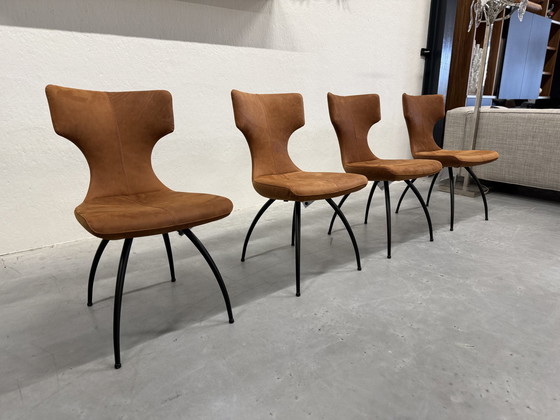 Cuatro nuevas sillas de comedor Leolux Callas con costuras decorativas Artisan, tapizadas en piel Danza color moca. Dimensiones: 50 x 63 x 88 cm (ancho x fondo x alto), 47 cm (alto x fondo). Precio de venta: 1025 € por silla. Ahora a la venta por 699 € cada una. Precio del conjunto: 2796 €.