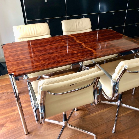 Se vende un juego de cuatro sillas Vitra Eames Soft Pad Chairs EA 208 Conference. Esta es la versión giratoria, en la altura clásica (altura del asiento 43 cm), tapizada en cuero color crema. Para mayor exclusividad, el respaldo del asiento también se cubrió en cuero como extra opcional. Diseño: Ray & Charles Eames, 1969 Estructura: aluminio fundido a presión, cromado Funda: cuero color crema - respaldo: cuero Las cuatro sillas están en muy buen estado con signos mínimos y normales de desgaste. No hay grietas ni manchas. El cuero ha sido tratado regularmente con el cuidado de cuero KERALUX. Con su diseño icónico pero sobrio, las Soft Pad Chairs EA 208 de Charles y Ray Eames son ideales tanto para áreas de reuniones y conferencias de lujo como para los espacios de estar más sofisticados. Gracias a su lujosa tapicería, ofrecen el más alto nivel de comodidad al sentarse.