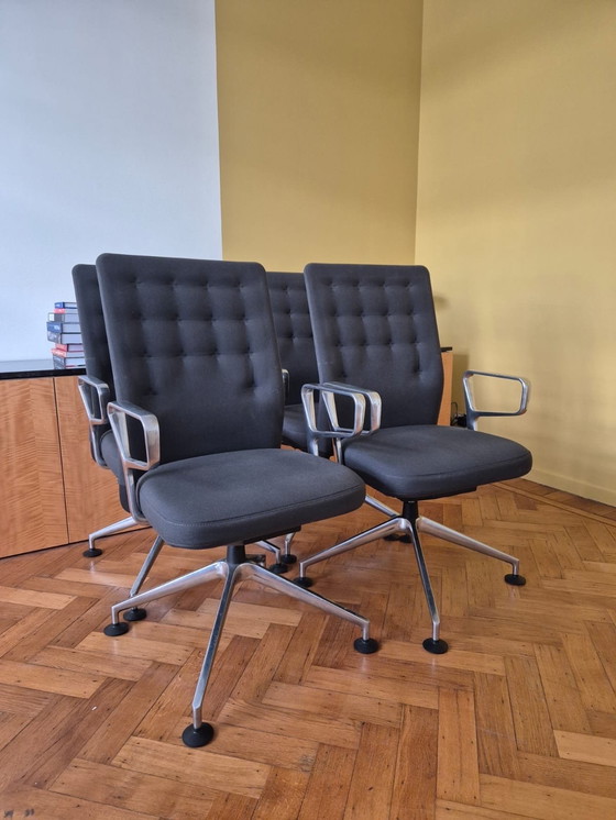 Juego de 4 sillas de conferencia Vitra ID Trim con reposabrazos y patas de aluminio. En esta configuración (aluminio), cada silla se vende por 1495 € en la página web de Vitra. La tapicería del asiento es desenfundable para facilitar el mantenimiento. En muy buen estado.