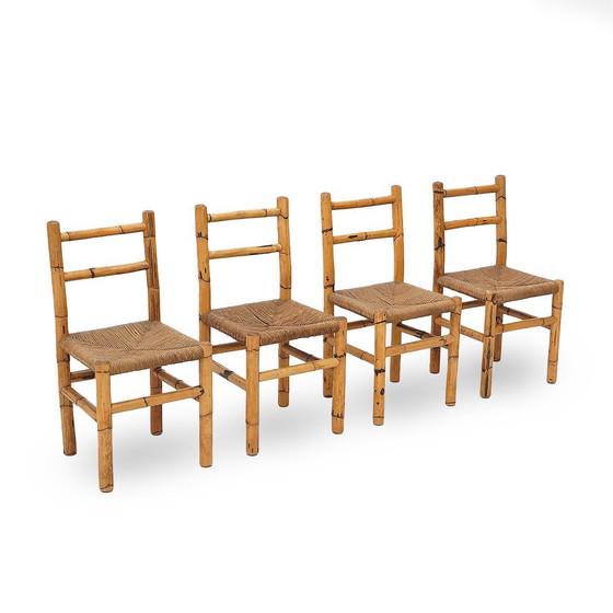 4 sillas italianas de la década de 1960. Estructura de ratán. Asiento de paja trenzada. Buen estado general, con ligeras señales de uso. Un asiento presenta manchas. Dimensiones: Largo 43 cm - Fondo 44 cm - Alto 86 cm - Altura del asiento 45 cm. REF S1003