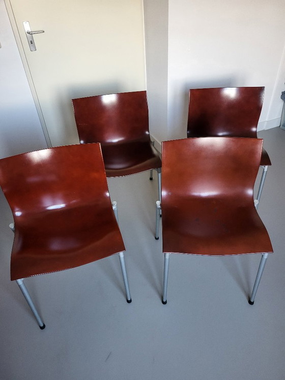 Cuatro sillas rojo oscuro/marrón de Driade (diseñadas por Philippe Starck) de 1999. Una de ellas presenta algunos daños (ver foto). El asiento es de contrachapado moldeado. Son muy cómodas. La base es de metal.