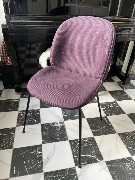 Un juego de cuatro sillas Gubi Beetle. Estas icónicas sillas son un clásico del diseño y se integran a la perfección en cualquier interior moderno. Están usadas, pero siguen siendo muy bonitas y cómodas. Están tapizadas en una lujosa tela acanalada morada y tienen una estructura de metal negro. ¡Una gran oportunidad para adquirir un juego de estas codiciadas sillas!