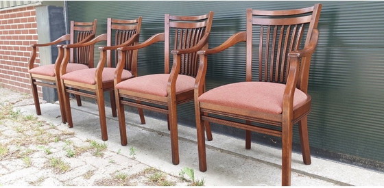 Realce su comedor con este elegante juego de cuatro sillas de comedor Bannink, elaboradas en lujosa madera de cerezo. Cada silla es una obra maestra del diseño, con elegantes reposabrazos curvados y un refinado respaldo de listones que irradia elegancia. El rico acabado de la madera de cerezo combina a la perfección con los cálidos asientos tapizados, ofreciendo comodidad y elegancia. Estas sillas son ideales para quienes aprecian la belleza atemporal y la artesanía superior en sus interiores.