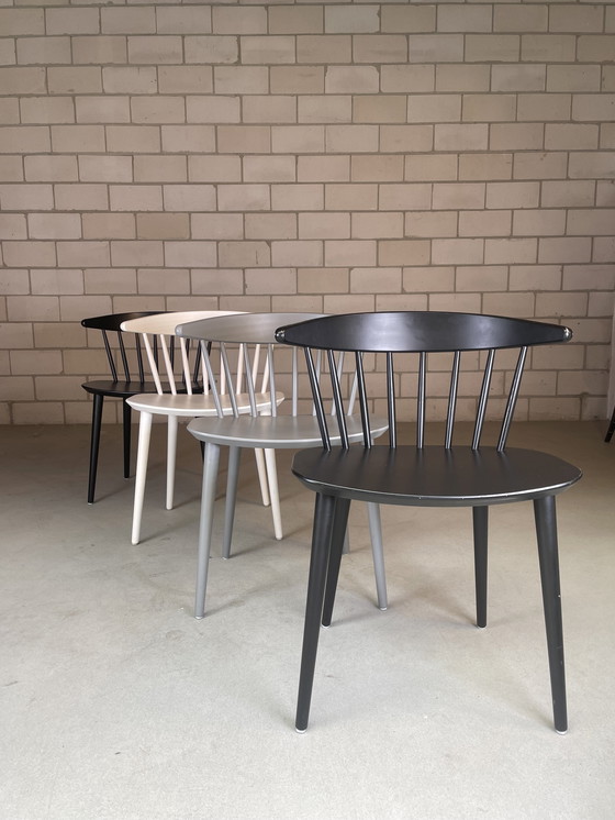 4 sillas Hay J104 en negro/gris/blanco. La silla Hay J104 combina a la perfección diseño clásico y moderno. Fabricada en robusta madera de haya, esta silla ofrece estilo, durabilidad y comodidad. Su diseño, inspirado en las sillas tradicionales Windsor, presenta ligeras marcas de uso. Se vende en un juego de 4 (2 negras, 1 gris y 1 blanca).