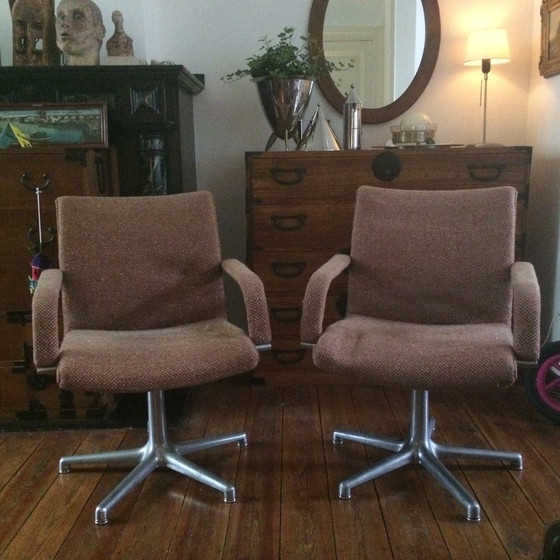 Diseñado por Geoffrey Harcourt para Artifort (década de 1970). Preciosa y elegante silla Artifort Channel (sillón) de estilo industrial. Tapizado en tela marrón-naranja. La tela de los reposabrazos y los asientos está en buen estado. Base de aluminio pulido y asiento giratorio. Ideal para mesa de comedor, oficina y sala de estar. Buen estado vintage con ligeras marcas de uso. 61 cm de ancho x 90 cm de alto x 64 cm de profundidad. Altura del asiento: 52 cm, profundidad del asiento: 42 cm. 4 piezas.