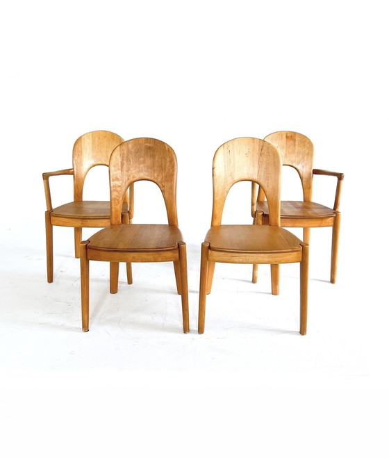 Juego de 4 sillas de comedor vintage diseñadas por John Mortensen para Koefoeds Hornslet, década de 1960. Hermosas estructuras de aliso macizo con vetas visibles y un encantador tono cálido. Las estructuras tienen formas orgánicas y hermosos acabados redondeados. Todas son estructuralmente sólidas y se encuentran en excelente estado. Dos sillas tienen reposabrazos, una rareza en este modelo. El asiento se puede desmontar y tapizar fácilmente si se desea. Un hermoso conjunto de piezas llamativas en muy buen estado. Todas están marcadas en la parte inferior. Dimensiones: Alto 89 cm, Ancho 49 cm/54 cm, Fondo 55 cm, Altura del asiento 46 cm.
