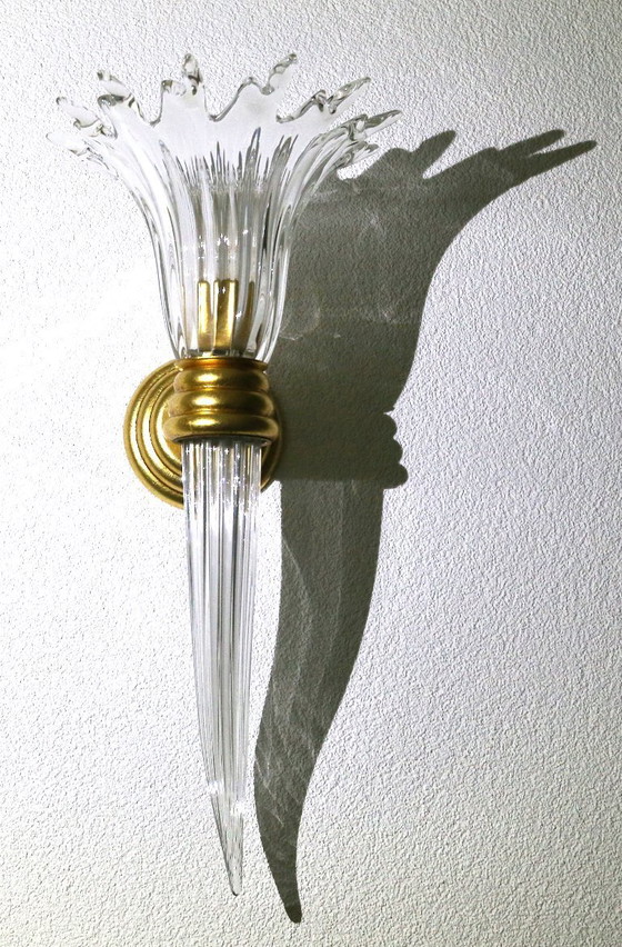 Especificaciones técnicas: Aplique de pared con estructura metálica con acabado en pan de oro, ¡VIDRIO DE MURANO hecho a mano!