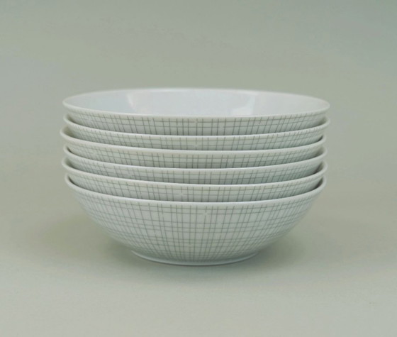 6 platos pequeños/cuencos de porcelana blanca con decoración gris claro. Diseñados por Heinrich Löffelhardt para Arzberg Porzellan en 1957. Un clásico del diseño, galardonado con la medalla de oro en la XI Trienal de Milán de 1957. Marcados Arzberg 411.