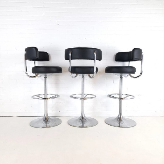 Sin respaldo, modelo Classic 01, ancho 40, alto 82, profundidad 40, diámetro del asiento 36, altura del asiento 82. Con respaldo, modelo Jupiter, ancho 53, alto 108, profundidad 51, diámetro del asiento redondo 43, altura del asiento 82. Börje Johanson, diseño de los años 70. Cuero negro/cromo. Base de trompeta giratoria. Diseño sueco, Markaryd. Precio por juego de 6 piezas. En estado usado, las fotos forman parte de la descripción. Los defectos se describen siempre según nuestro leal saber y entender. Precios fijos.