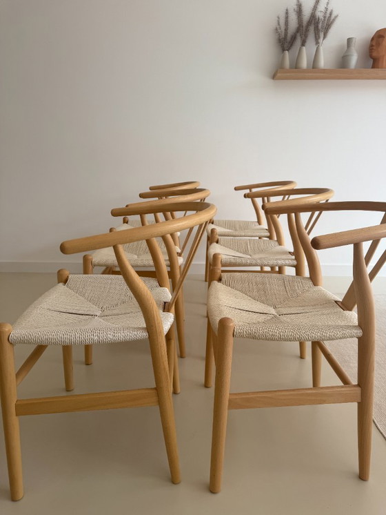 Juego de seis elegantes sillas Bone de madera de haya natural. Son piezas de alta calidad, fabricadas con madera de haya maciza y cuerda de papel; resistentes, duraderas y acabadas con atención al detalle.