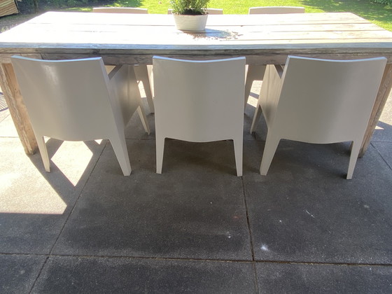 Juego de 6 sillas Driade Toy diseñadas por Philippe Starck, para uso interior y exterior. Color gris claro. Tienen algunos pequeños arañazos, debidos al apilamiento. Las sillas están limpias e intactas. Se venden con cojines y sólo como juego completo.