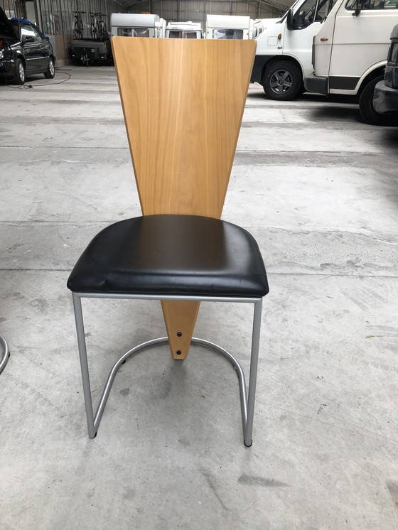 Juego de 6 sillas Harvink Zino, un magnífico ejemplo de diseño holandés. Estas sillas combinan elegantemente madera, metal y cuero, ofreciendo estilo y comodidad. El respaldo de madera y el asiento de cuero le dan una estética moderna, mientras que las patas de metal garantizan su durabilidad. Perfectas para comedores o como sillas decorativas en cualquier ambiente contemporáneo. En algunas sillas, la lona que cubre la parte inferior (no visible) se está desprendiendo y podría necesitar ser grapada.
