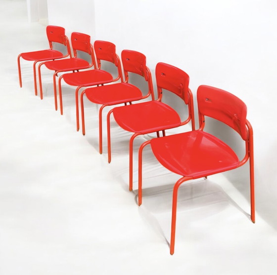 Este conjunto de seis sillas Folke fue creado en colaboración entre IKEA y Box 25 Architects. Fue el primer diseño de Niels Gammelgaard para la colaboración con IKEA. Aparecieron en el catálogo de 1976. Las sillas apilables están hechas de metal y plástico de alta calidad y tienen respaldo reclinable. Están usadas, pero en buen estado. Llevan la marca IKEA Box 25.