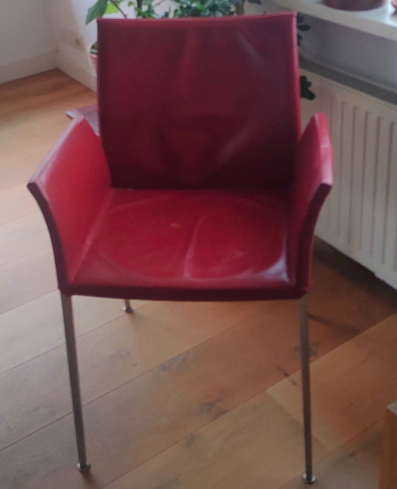Juego de 6 sillas de comedor Zanotta Lia con un diseño moderno y elegante. Están tapizadas en vibrante cuero rojo y cuentan con robustas patas de metal. Perfectas para añadir un toque de color y estilo a su comedor. Una de las 6 sillas es un sillón.