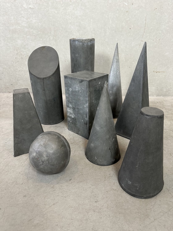 Conjunto muy decorativo de formas geométricas de zinc. La esfera se puede desmontar. Las formas más grandes tienen una altura de 30 cm. La forma más ancha mide 11 cm. Peso total: 2,5 kg. Signos de uso aceptables. Difícil de encontrar.