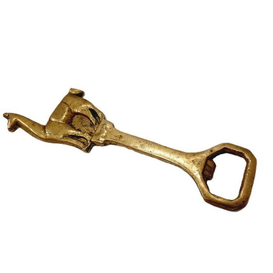 Abridor de botellas de cerveza antiguo de latón con una llama en el mango