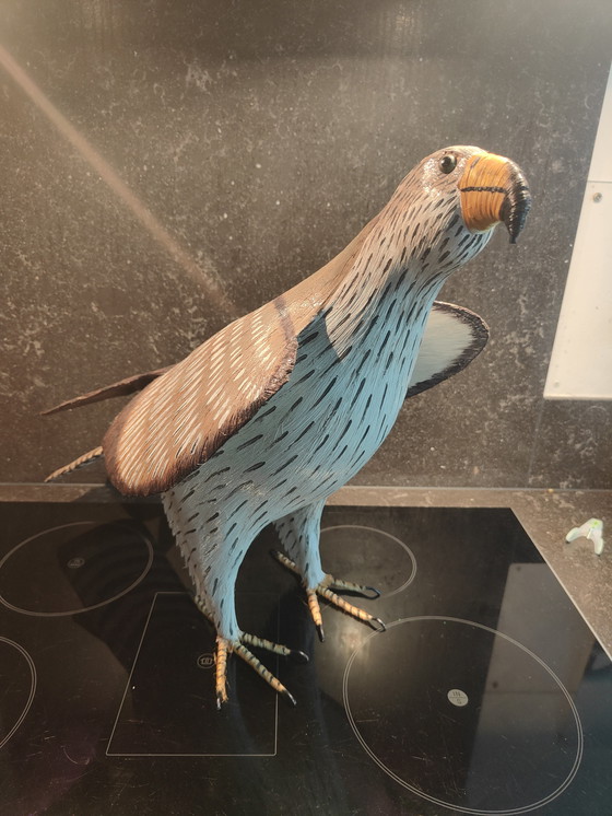 Águila perdicera/águila azor hecha de fibras naturales, hecha y pintada a mano. Pieza única 100% artesanal. Tamaño original: Alto 47 cm, Ancho 29 cm, Largo 80 cm. Un hermoso ejemplar para el jardín o balcón. No molestará más a otras aves. O simplemente como pieza de exhibición en la sala de estar. Tamaño real: Se trata de una especie de águila poderosa de tamaño pequeño a mediano, con una longitud de 55-65 cm y una envergadura de 145-165 cm. Un águila azor tarda 5 años en desarrollar su plumaje adulto, como se describe a continuación. Las partes superiores son de color marrón oscuro y las inferiores son blancas con rayas oscuras. La forma adulta muestra un parche de manto blanco en vuelo y tiene una curva alar hacia adelante con un borde posterior recto. Las alas son relativamente cortas y redondeadas. En vuelo, las puntas de las alas son moderadamente prominentes para un águila de este tipo. La cola larga es gris por encima y blanca por debajo.