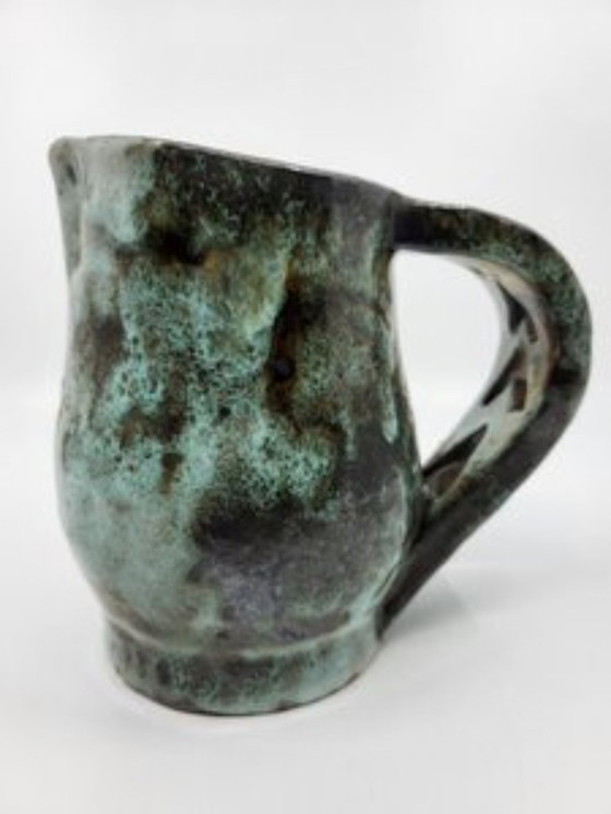 Esta jarra, firmada por Alexandre Kostanda, es una pieza emblemática del gres esmaltado francés de Vallauris, que data de los años cuarenta. La reputación de Vallauris, en la Costa Azul, ha atraído a numerosos artistas y artesanos, y Kostanda es uno de los diseñadores que ha sabido captar el espíritu de su época a través de obras coloristas y refinadas. Esta jarra presenta diseños únicos y un acabado esmaltado que refleja la calidez y el carácter de la región. Encarna no sólo la artesanía local de la época, sino también el vibrante estilo de vida de la Riviera francesa. Pieza de coleccionista ideal para los amantes del arte y los entusiastas de la cerámica, esta jarra combina estética y funcionalidad, a la vez que cuenta un pedazo de la historia del arte francés.