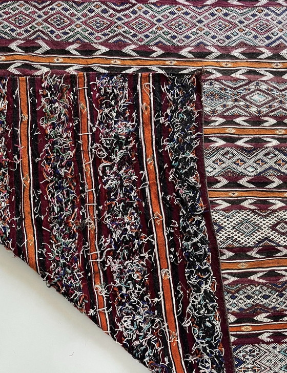 Esta alfombra oblonga, de 3,40 x 1,60 metros, fue anudada a mano alrededor de 1980 por mujeres bereberes en el Atlas Medio. Su color intenso y cálido, su textura compacta y su lana resistente la convierten en una alfombra no solo hermosa a la vista, sino también cómoda.