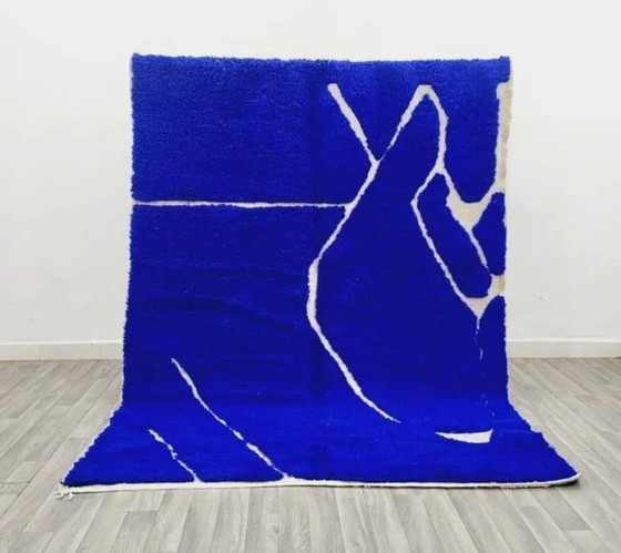 Realza tu hogar con esta exquisita alfombra bereber azul, elaborada artesanalmente y con unas impresionantes dimensiones de 300 cm x 200 cm. Esta alfombra es un testimonio de la rica tradición artesanal bereber, con un llamativo tono azul entrelazado con elegantes motivos blancos que evocan un toque de arte moderno.