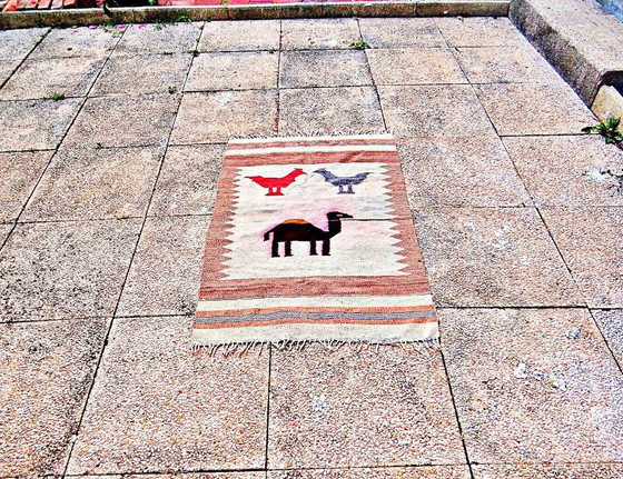 Realizado con la técnica del tejido plano, tiene un aspecto poco vistoso, revelando toda la belleza natural de la lana con su simbolismo ligado al folclore local y a la naturaleza: el camello representa la supervivencia en medios áridos y la robustez en el calor del desierto, y los pájaros simbolizan la libertad y la protección.