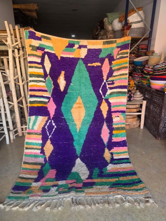 Esta alfombra Boujaad marroquí te invita a explorar sus vibrantes patrones y colores, y promete ser una adición cautivadora a la decoración de tu hogar.