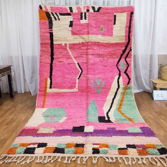 Descubra esta magnífica alfombra de lana rosa, de 250 cm por 150 cm, que aportará un toque de color y calidez a su hogar. Con sus atrevidos motivos geométricos y sus tonos vibrantes, esta alfombra es la encarnación perfecta del estilo bohemio, ideal para quienes buscan añadir un toque artístico y único a su espacio vital.