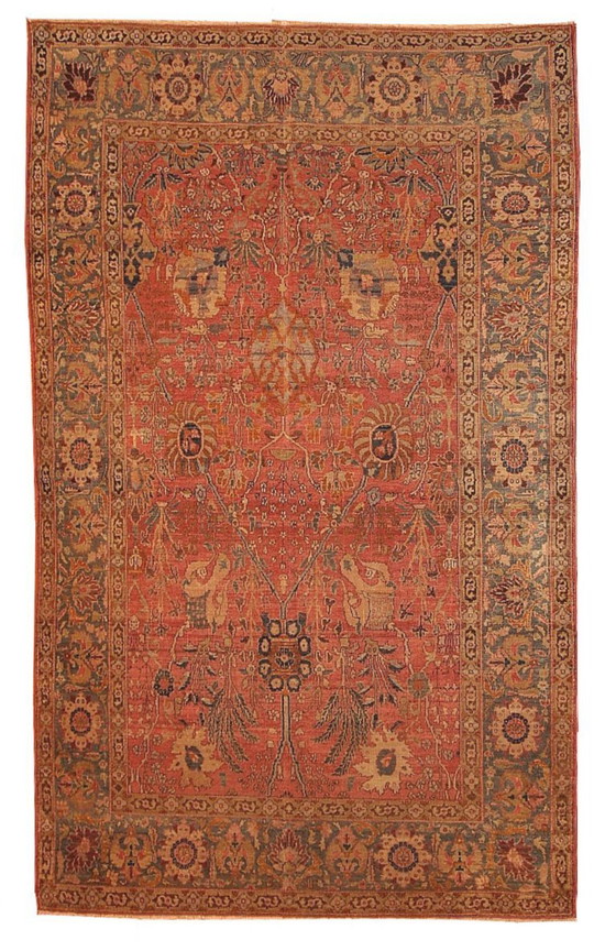 Alfombra india Loristán de tejido fino en tonos melocotón y coral. Diseño floral por toda la superficie con detalles en azul grisáceo. Se encuentra en buen estado original.