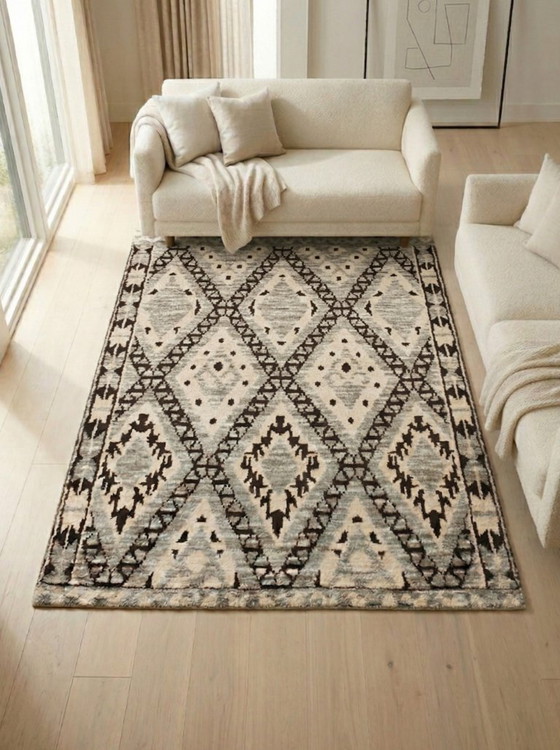 Añade un toque cálido y elegante a tu hogar con esta alfombra de lana gruesa, inspirada en los patrones bereberes tradicionales.