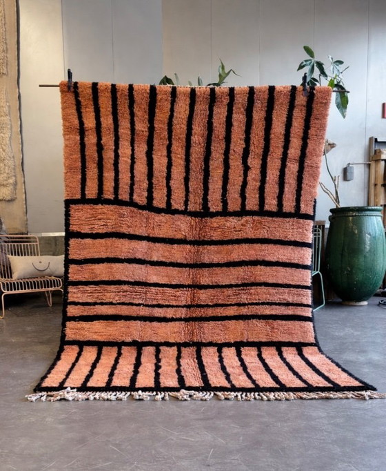 Esta pieza presenta un cálido fondo de lana marrón terroso combinado con llamativos motivos lineales negros, creando un marcado ritmo arquitectónico. La composición de rayas verticales y horizontales le confiere un carácter moderno y gráfico, a la vez que mantiene una profunda influencia en el diseño tradicional bereber. Sus tonos naturales aportan calidez y elegancia a interiores contemporáneos, minimalistas o bohemios.