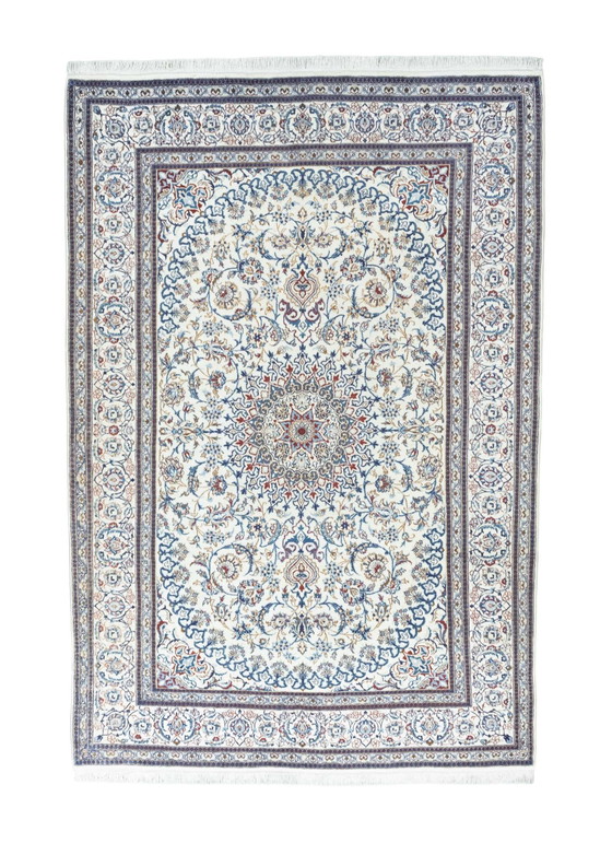 Esta exquisita alfombra Nain 9La, anudada a mano y con contenido de seda, es una auténtica obra maestra del anudado tradicional. Su delicado diseño, la armoniosa paleta de colores en tonos azules, beige y crema, y el medallón central le confieren una elegancia atemporal. ✔ Tamaño: 295 x 200 cm ✔ Material: Lana virgen de alta calidad con seda fina ✔ Nudos: Anudado muy fino para un máximo nivel de detalle ✔ Diseño: Diseño clásico Nain con ornamentación precisa ✔ Artesanía: Elaborada con gran esmero por expertos tejedores de alfombras 🌟 Característica especial: El contenido de seda le confiere a la alfombra un brillo refinado y una estructura especialmente fina. 📦 Envío seguro: Ofrecemos envío seguro y asegurado para garantizar que su alfombra llegue sin problemas. N.º: 53557