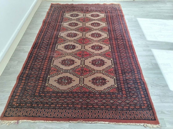 Alfombra pakistaní de Bujará hecha a mano en buen estado general. (31)