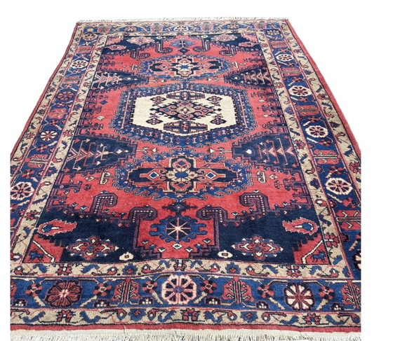 Hermosa alfombra persa suiza anudada a mano, hecha en Irán. Dimensiones: 217 x 315 cm (sin flecos). Colores: Rojo, blanco, rosa, azul claro, azul oscuro, beige, negro, blanco. Material: Lana sobre algodón. Estado: Buen estado vintage, con signos de desgaste propios de su antigüedad (ver fotos). La alfombra está completamente limpia y lista para usar de inmediato. Origen: Irán.