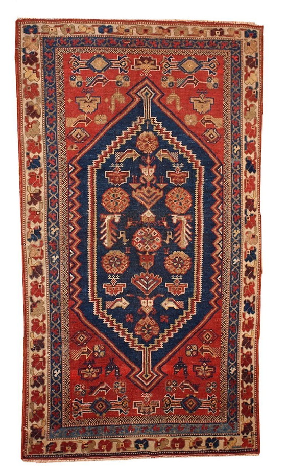 Alfombra persa Shiraz con diseño tribal en tonos azul marino y rojo. Esta alfombra se encuentra en buen estado original.