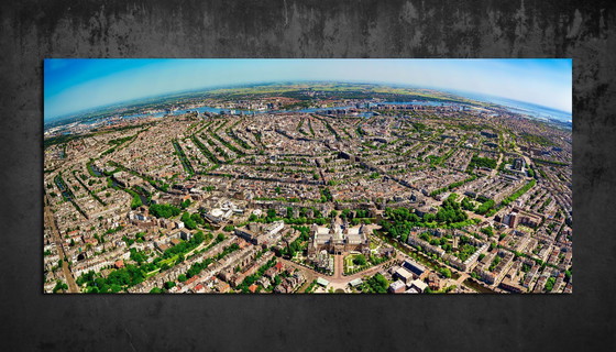 Creada en 2021 por Robbert Frank Hagens. Esta panorámica ofrece una hermosa vista del centro de la ciudad con sus canales y el Rijksmuseum en primer plano. Gracias a una técnica fotográfica especial, la imagen es nítida y presenta un singular efecto de globo terráqueo.