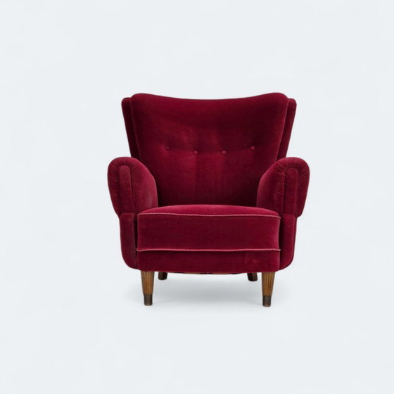 Sillón danés de los años 60. Retapizado por un artesano hace unos 10-15 años. Muy buen estado: sin olores, sin manchas y construcción estable. Muebles de terciopelo rojo cereza, patas de madera de haya con tacos de latón, muelles de latón en el asiento. Fabricado por un fabricante de muebles danés entre 1960 y 1965. Diseño vintage escandinavo original directamente de Dinamarca. La silla fue revisada por artesanos.