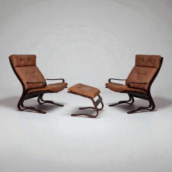 Años 70, diseño noruego de Else & Nordahl Solheim, juego de 2 sillas con reposapiés, modelo "Kengu".
