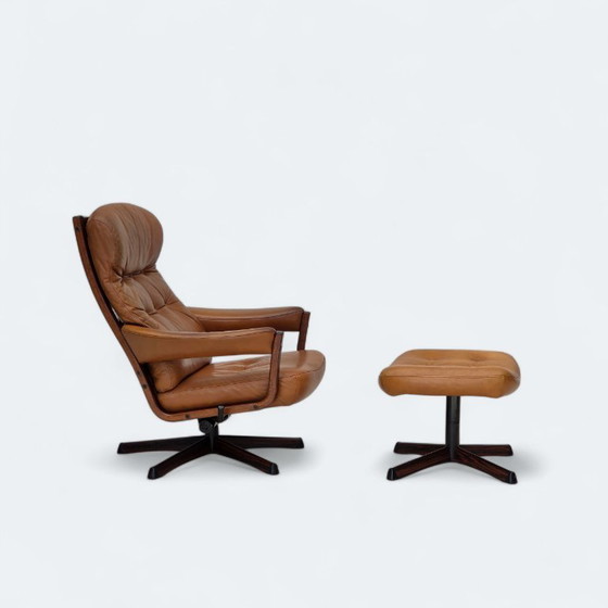 Años 70, diseño sueco de Gote Möbler, silla giratoria con reposapiés, cuero.