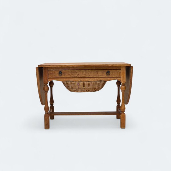 Años 70, mesa de centro danesa plegable, madera de roble, ratán, estado original.