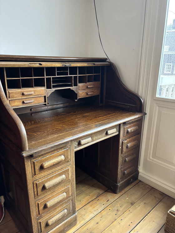Retroceda en el tiempo con este exquisito escritorio antiguo con tapa enrollable, un verdadero testimonio de la artesanía y la elegancia atemporales. Sus ricos y cálidos tonos de madera y su clásico diseño con tapa enrollable lo convierten en una pieza central distinguida para cualquier oficina o estudio.