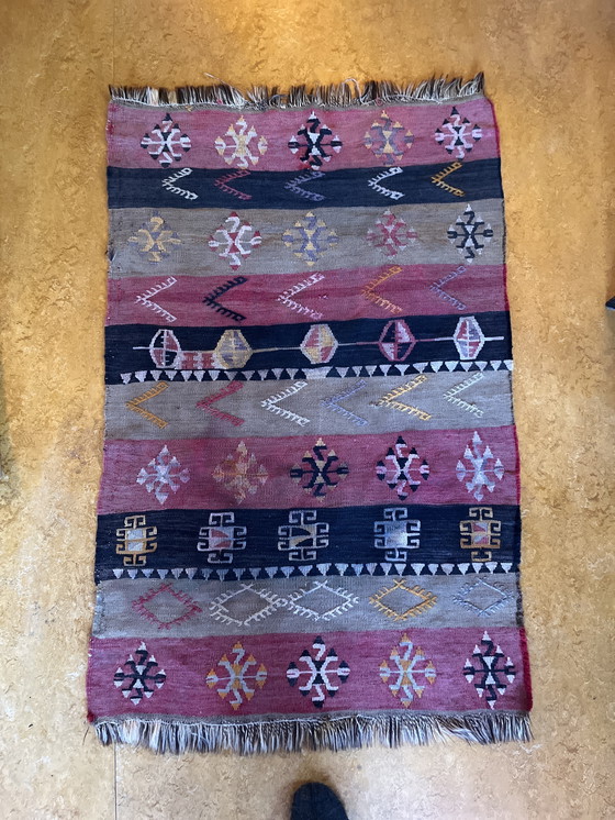 Incorpora una pieza de patrimonio cultural a tu hogar con este exquisito kilim, perfecto para añadir calidez y carácter a cualquier estancia.