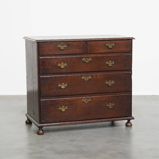 Se ofrece esta preciosa cómoda/cómoda inglesa antigua de roble del siglo XVIII con patas de bola originales y 5 cajones.