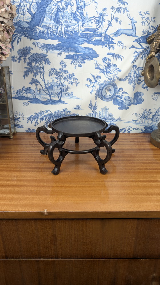 Fabricado por artesanos chinos, este soporte, pedestal o silla de bronce destaca por su forma orgánica y floral, inspirada en el estilo Art Nouveau asiático de mediados del siglo XX.
