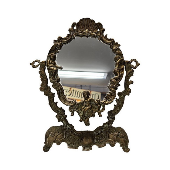 Este antiguo espejo de mesa francés de bronce es un objeto hermoso y único de mediados del siglo XX. El espejo tiene un elegante marco de bronce con detalles refinados, incluido un ángel ornamentado que le da un aspecto romántico y clásico. El espejo puede ajustarse a la posición correcta girando unos pomos.
