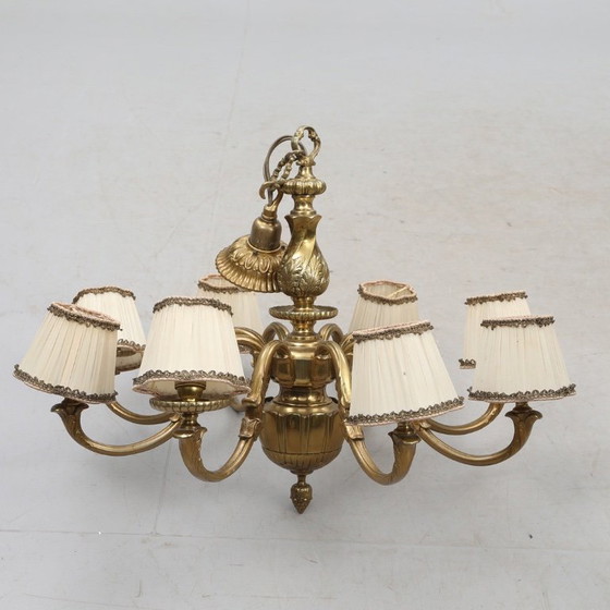 Antique brass chandelier dating from 1920–1930, with eight fittings, dimensions 21 cm wide, 55 cm high and 75 cm deep, in good