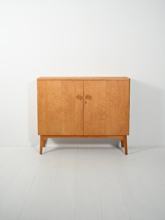 Aparador alto de chapa de abedul de la década de 1940 con dos puertas abatibles, patas en ángulo y un interior impecable con estantes y cajones para cubiertos.