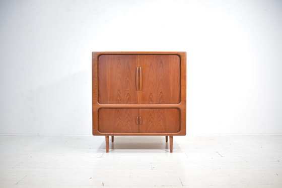 Aparador Dyrlund. Aparador de teca usado como mueble multimedia con puertas enrollables. Panel deslizante en la parte inferior y orificios para cables en los paneles trasero e inferior. 105 cm de ancho, 62 cm de fondo y 114 cm de alto. Diseño danés de mediados de siglo en muy buen estado vintage. 1500 €