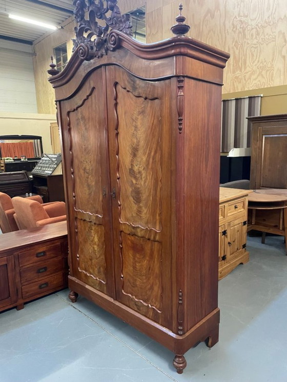 Este mueble evoca aquellos bellos tiempos del pasado, cuando aún se dedicaba tiempo a crear piezas tan especiales para la habitación. Sus medidas de profundidad son: 48 cm para el mueble y 65 cm para la cornisa. Este espacioso mueble ofrece un amplio espacio de almacenamiento en los estantes y en los cajones. El mueble presenta signos de uso.